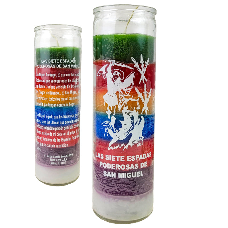 Call upon the mighty presence of Archangel Michael with the 7 Powerful Swords of St. Michael 7 Day Candle. Each vibrant layer represents one of his sacred swords: symbols of truth, protection, courage, and divine justice. This powerful spiritual tool is used to invoke St. Michael’s guidance in times of danger, spiritual warfare, or when facing life's battles.