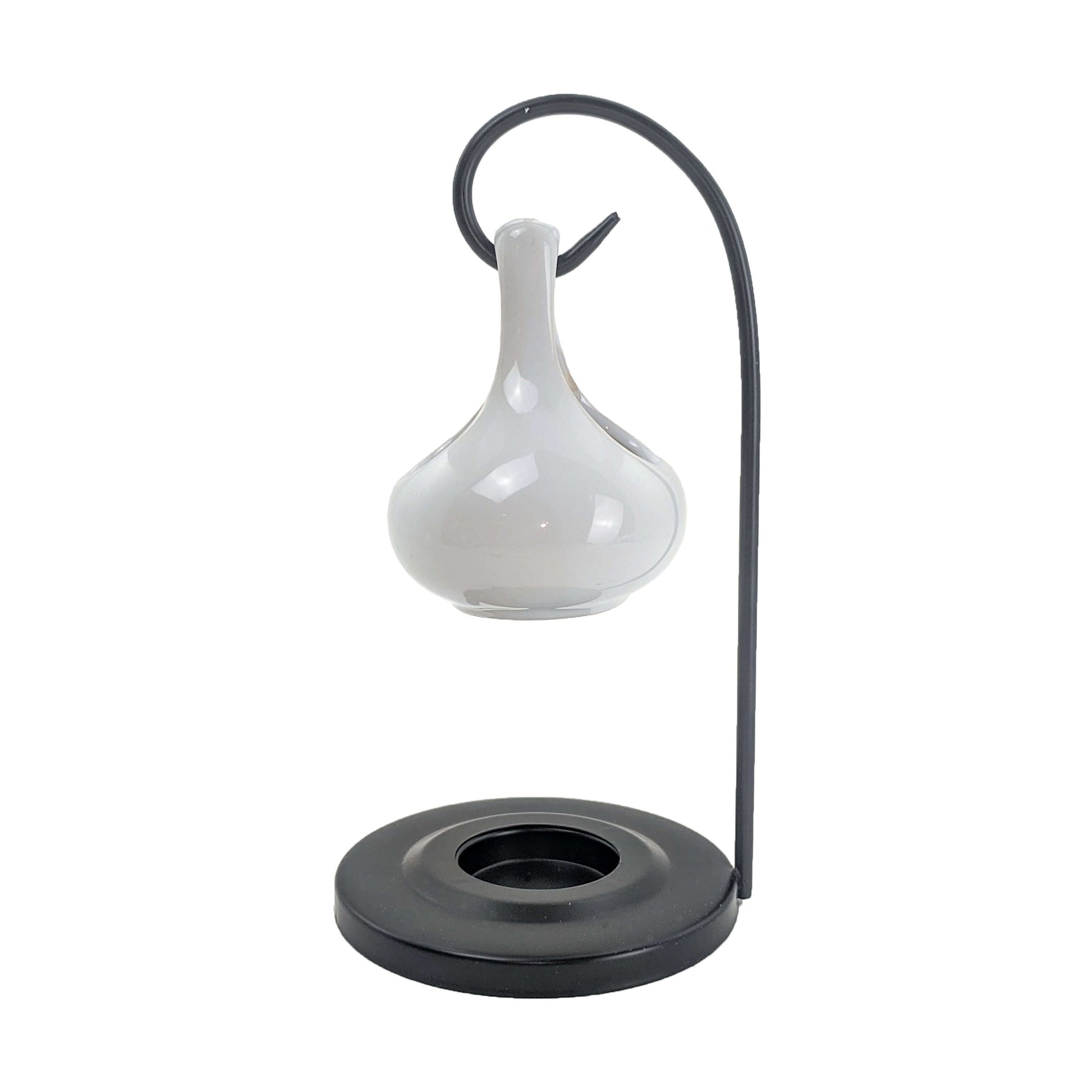 A metal loop balances the ceramic oil basin above a seated tealight to give off a warm glow along with your favorite scent.